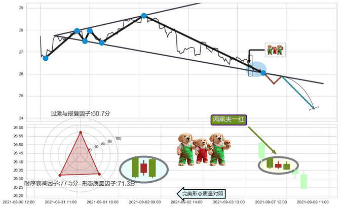 ➢ 🕰 价格走势在2021-09-07 10:00:00至2021-09-07 12:00:00期间形成两黑夹一红,残存影响值:-4.21
