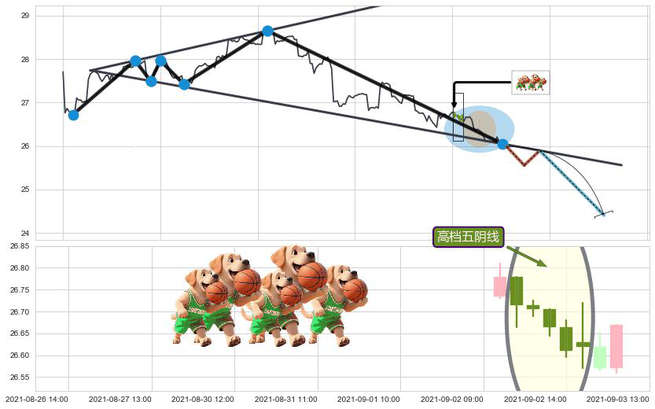 ➢ 🕰 价格走势在2021-09-02 11:00:00至2021-09-03 09:00:00期间形成高档五阴线,残存影响值:-1.45