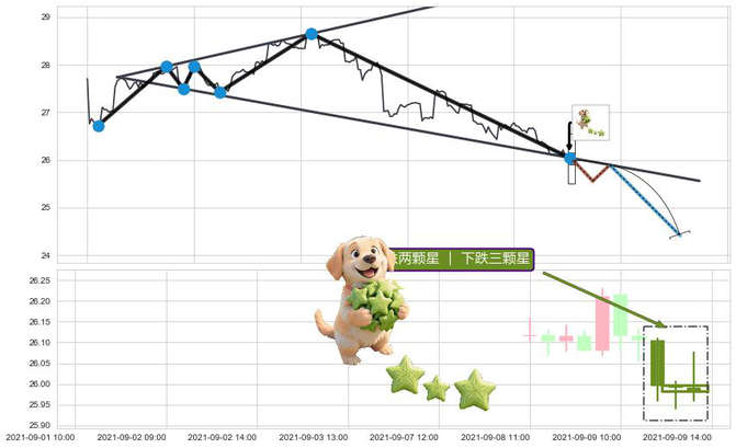 ➢ 下跌两颗星 | 下跌三颗星:下跌两三颗星配合支撑破位性质的信号叠加可信度大幅增强,形态主因为短线强支撑筹码倒手所致