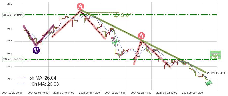 ♘ 阻力价格位28.55,可信任强度82.80%,距离最后交易2021-09-09 14:00形成的收盘价格25.98相差 +9.89%