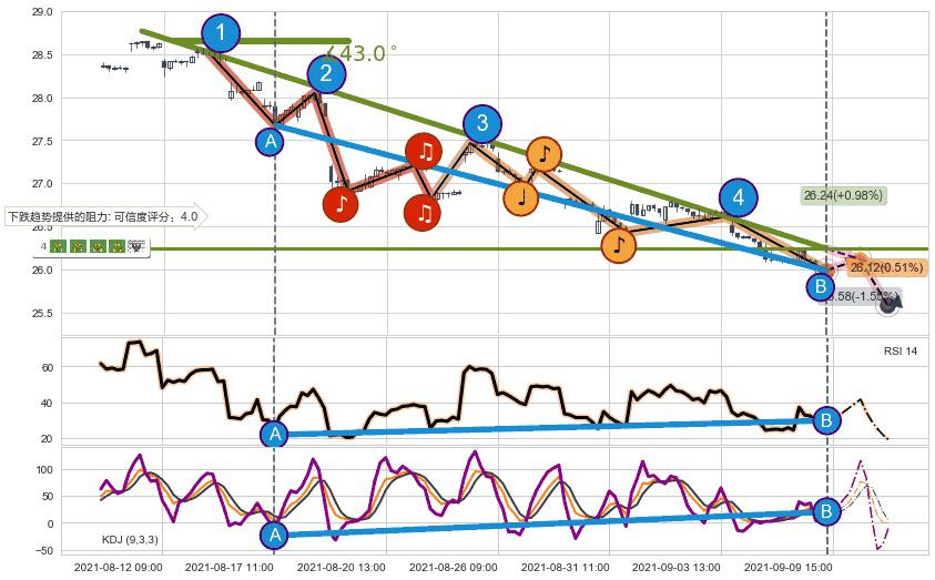 ♘ 在最后的下跌阶段2021-08-11 11:00至2021-09-09 14:00,存在 持续未破位的阻力位 ,阻力价格26.24,可信任强度82.12%,其距离最后价格25.98相差 +0.98%