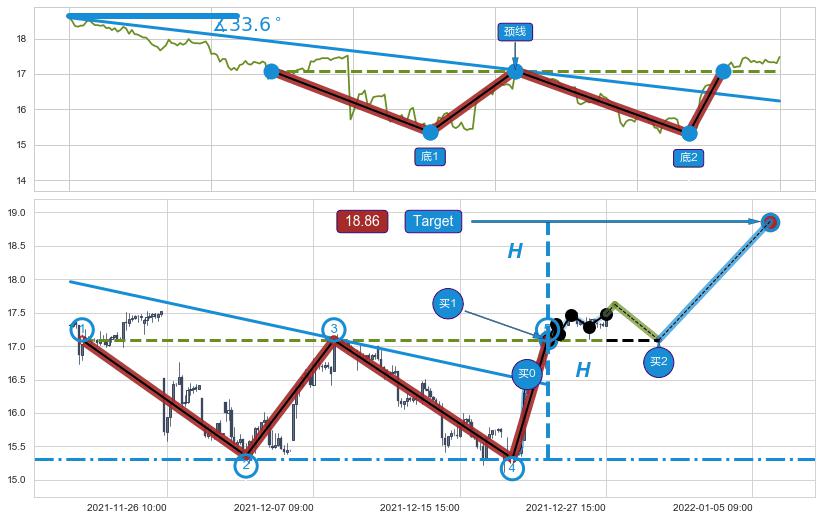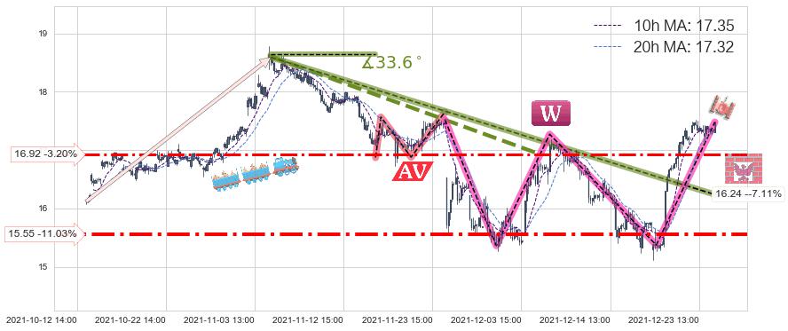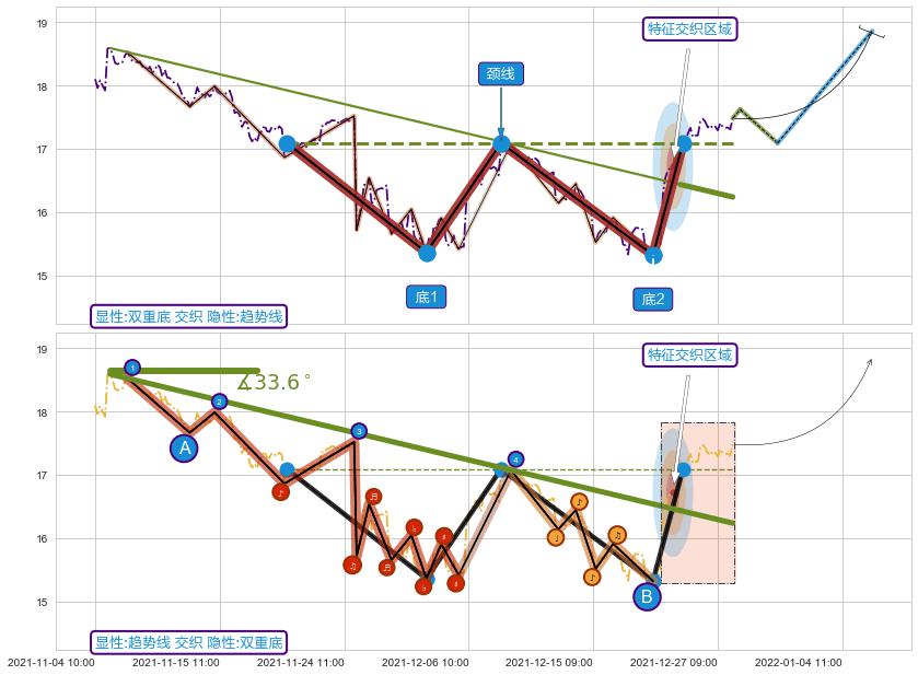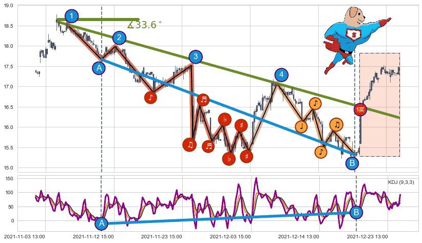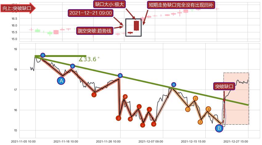 ➣ 2021-11-05 10:00-2021-12-22 09:00下跌趋势存在反转上涨[机会],其原下跌趋势的阻力位(16.24)已被突破[强支撑信号],原下跌趋势角度: 33.6˚