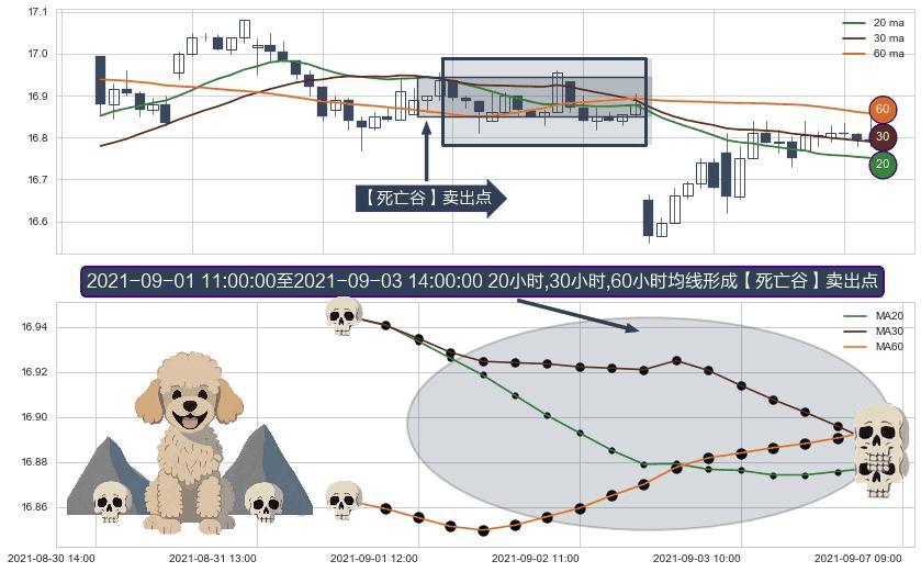 形态多维评估: ⚀ 2021-09-01 12:00:00-小时至2021-09-03 14:00:00-小时显现 20小时-30小时-60小时均线 【死亡谷】卖出点 看空信号,后市看跌,卖出