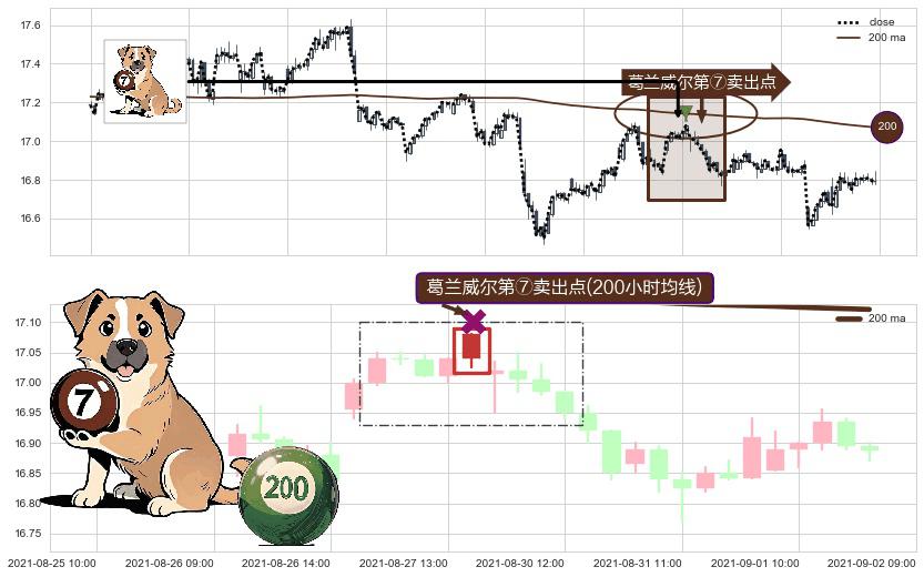 形态多维评估: ⚀ 2021-08-27 14:00:00-小时显现 葛兰威尔均线 200小时均线 第⑦卖出点 下降趋势的中继信号,后市看跌,卖出信号