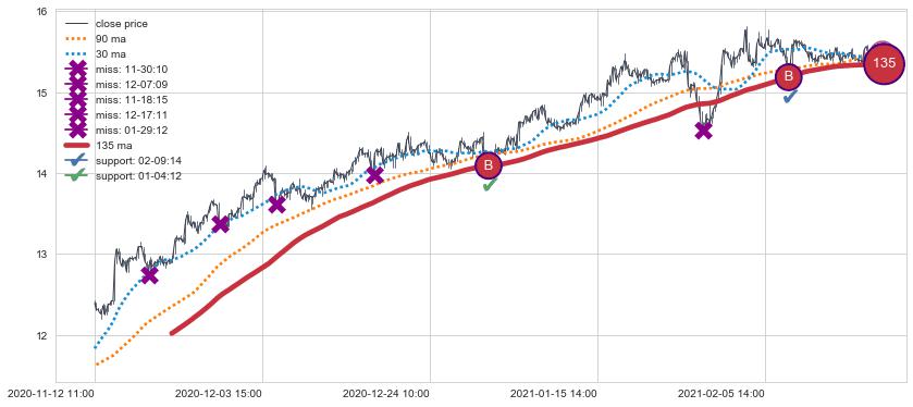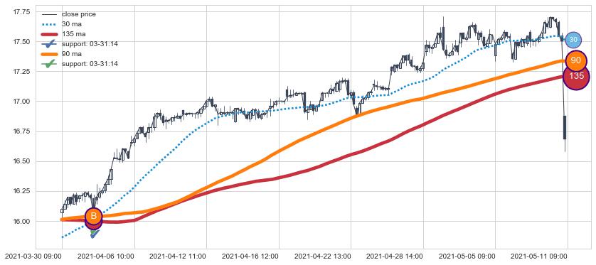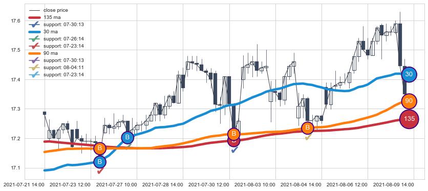 上涨趋势07-21 14:00-08-09 14:00,均线90, 30, 135确认关键支撑4处