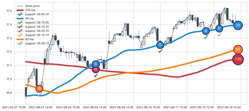上涨趋势05-27 14:00-06-16 14:00,均线90, 30, 135确认关键支撑5处