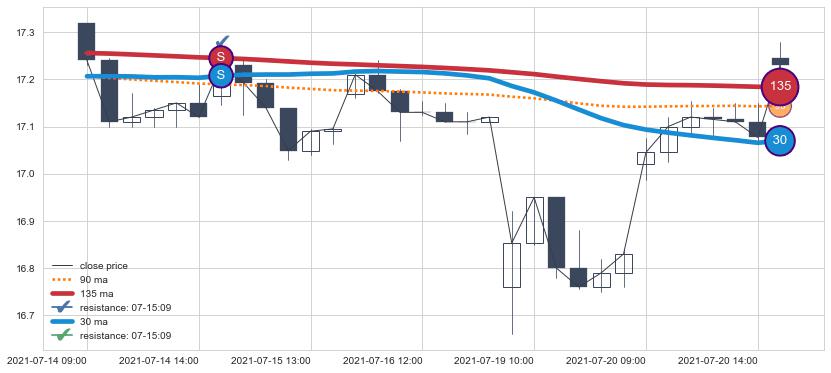 下跌趋势07-14 09:00-07-21 09:00,均线30, 135确认关键阻力1处