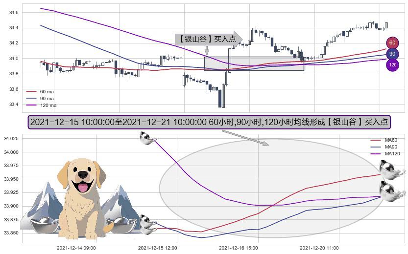 形态多维评估: ⚀ 2021-12-15 11:00:00-小时至2021-12-21 10:00:00-小时显现 60小时-90小时-120小时均线 【银山谷】买入点 看多信号,后市看涨,买入