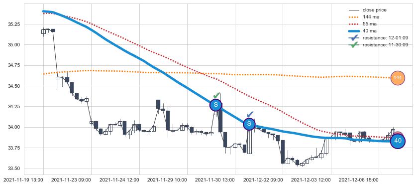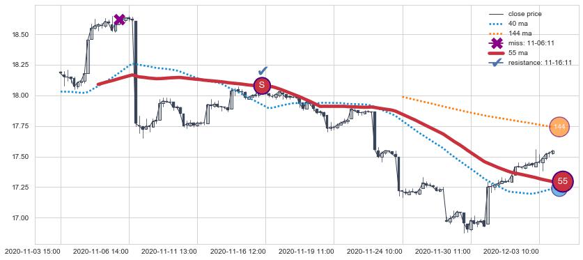 下跌趋势11-19 13:00-12-07 11:00,均线40确认关键阻力2处