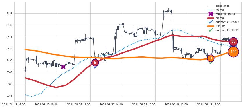 上涨趋势08-13 14:00-09-14 14:00,均线144, 55确认关键支撑2处