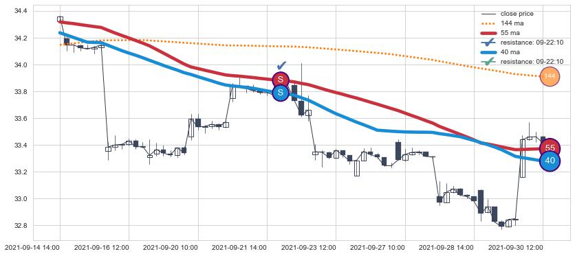 下跌趋势09-14 14:00-09-30 12:00,均线40, 55确认关键阻力1处