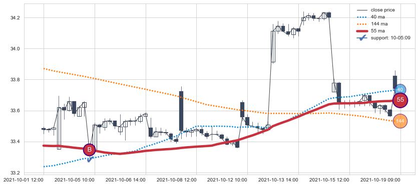 上涨趋势10-01 12:00-10-19 09:00,均线55确认关键支撑1处