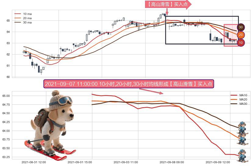 形态多维评估: ⚀ 2021-09-01 15:00:00小时-2021-09-09 14:00:00小时显现 10小时-20小时-30小时均线 【高山滑雪】买入点 看多信号,后市看涨,买入