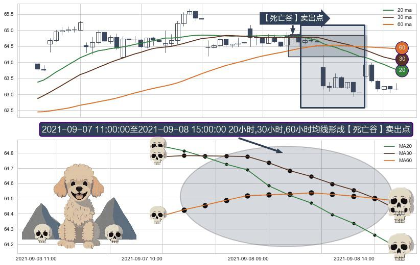 形态多维评估: ⚀ 2021-09-07 12:00:00-小时至2021-09-08 15:00:00-小时显现 20小时-30小时-60小时均线 【死亡谷】卖出点 看空信号,后市看跌,卖出