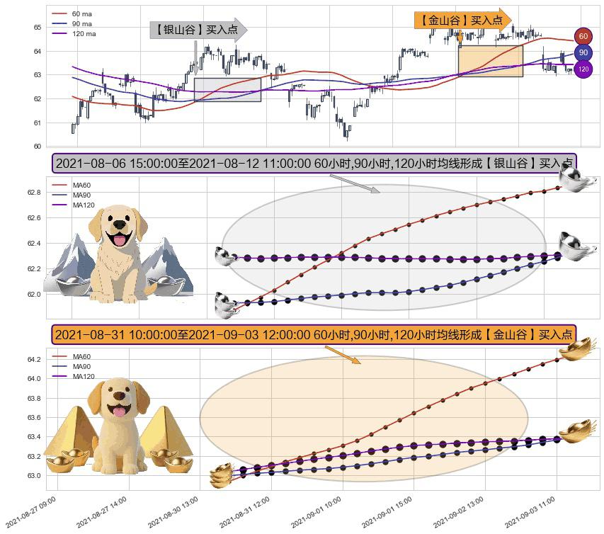 形态多维评估: ⚀ 2021-08-31 11:00:00-小时至2021-09-03 12:00:00-小时显现 60小时-90小时-120小时均线 【金山谷】买入点 其再次确认了买入信号,可靠性更强,买入