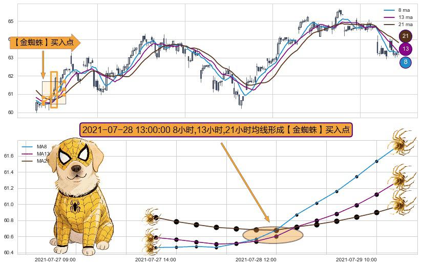形态多维评估: ⚀ 2021-07-28 13:00:00小时显现 8小时-13小时-21小时均线 【金蜘蛛】买入点 看多信号,后市看涨,买入
