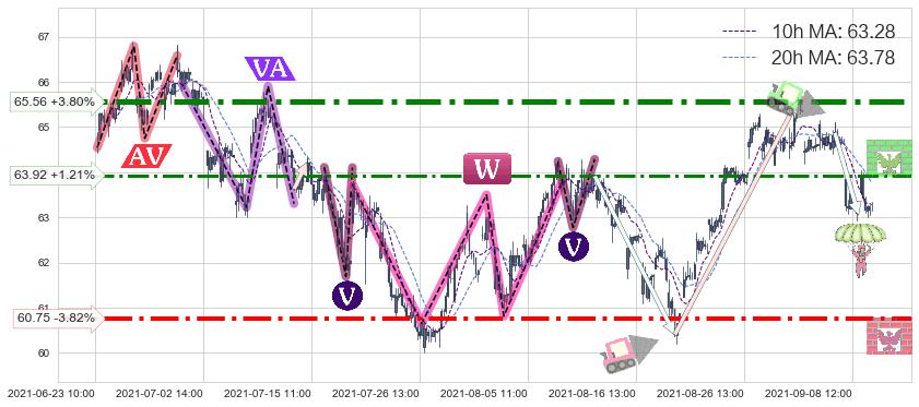 ♘ 阻力价格位63.92,可信任强度66.90%,距离最后交易2021-09-09 14:00形成的收盘价格63.16相差 +1.21%