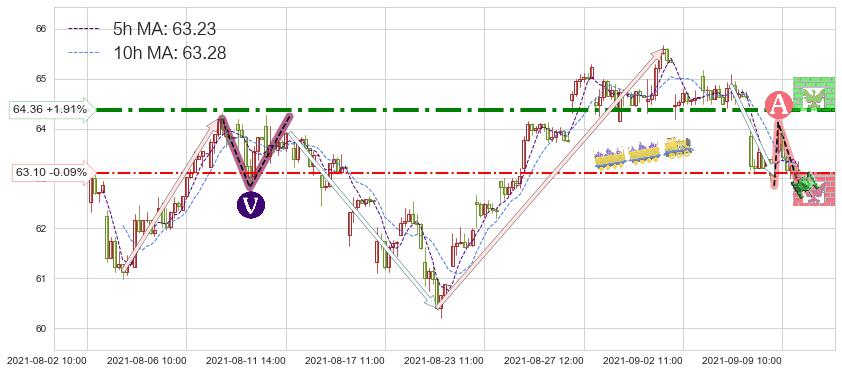 ♘ 阻力价格位64.36,可信任强度75.42%,距离最后交易2021-09-09 14:00形成的收盘价格63.16相差 +1.91%