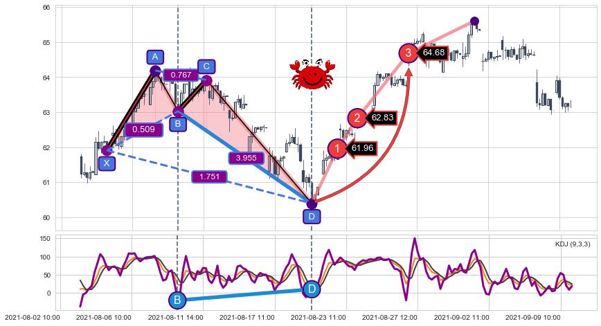 ➣ 已完成【螃蟹】形态起点X: 08-04:13, 终点D: 08-19:12, 共73交易小时