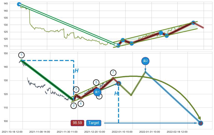 ➢ 【仅预测突破】最后价格:131.64与预测突破价格:127.95→【空间较大】后续最小【整理】第一目标价格→(03-01:11: 98.59 )