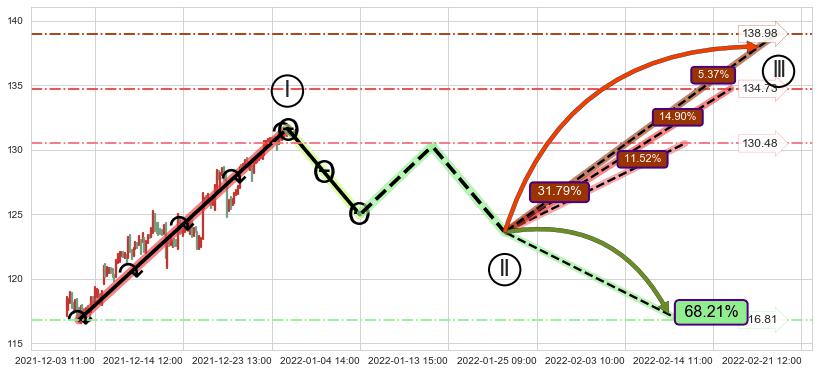 ➢ 循环浪继续向上【最高】位置(02-21:12, 138.98),匹配聚类样本比例16.89%, 可能性概率5.37%
