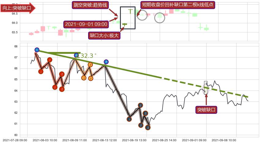 从2021-07-29 10:00至2021-08-23 09:00,共包含102个小时,阶段股价下跌-8.34%,阶段股价变动位移路程比: 1 : 4,下跌趋势角度: 32.3,2021-08-12 09:00向↘︎形成缺口,跳空下跌-2.94%˚