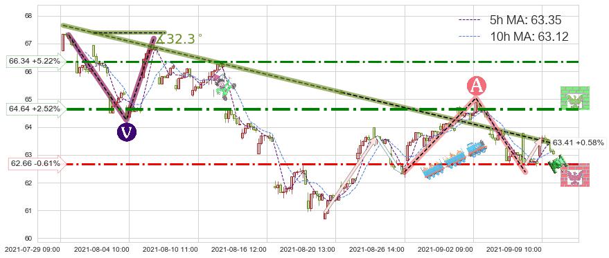 ➣ 2021-07-29 10:00-2021-08-23 09:00下跌趋势存在反转上涨[机会],虽然原下跌趋势的阻力位(63.41)已被突破,但其阻力效果尚存,原下跌趋势角度: 32.3˚
