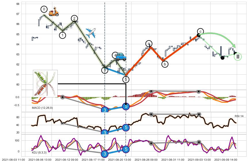 ➢ 1,3,5驱动浪MACD, RSI, KDJ走势都出现【常规背离】反转信号增强
