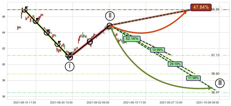 ➢ 循环浪继续向下【最低】位置(10-08:09, 56.47),匹配聚类样本比例22.97%, 可能性概率11.98%