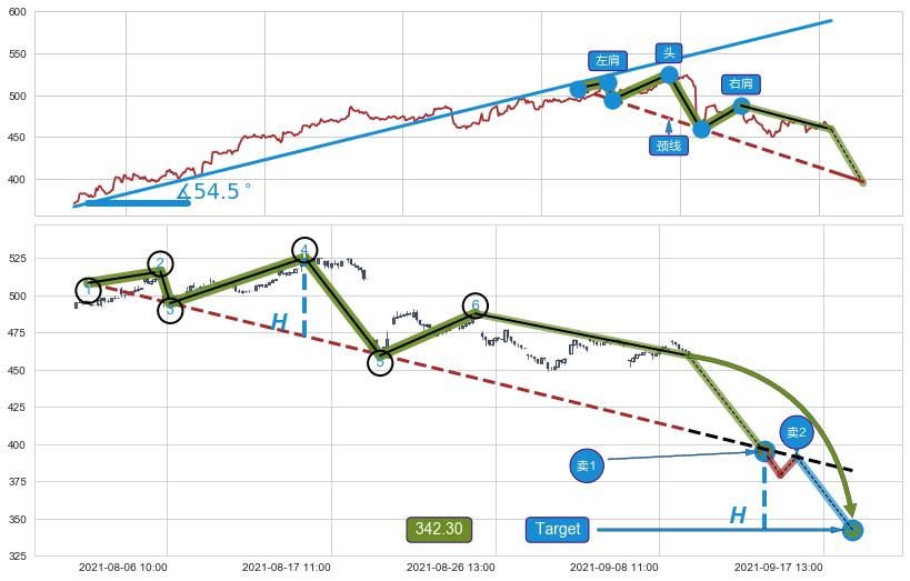 ➣ 最小反转跌幅→𝐇: 52.59 (头部与颈线垂直距离)