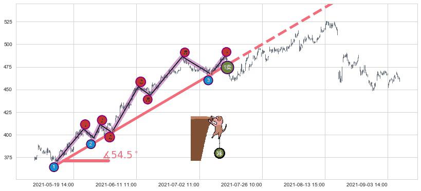 ✂️ 2021-05-13 12:00-2021-07-14 14:00上升趋势存在反转[风险],其原上升趋势的支撑位(588.87)已破位[强阻力信号],原上升趋势角度: 54.5˚