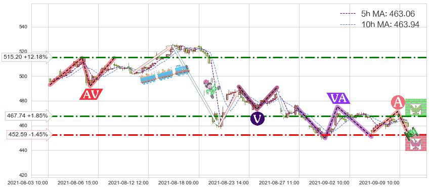♘ 阻力价格位467.74,可信任强度64.75%,距离最后交易2021-09-09 14:00形成的收盘价格459.25相差 +1.85%