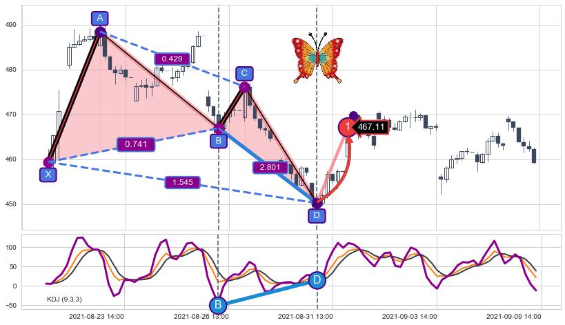 ➣ 已完成【蝴蝶】形态起点X: 08-19:12, 终点D: 08-31:10, 共53交易小时
