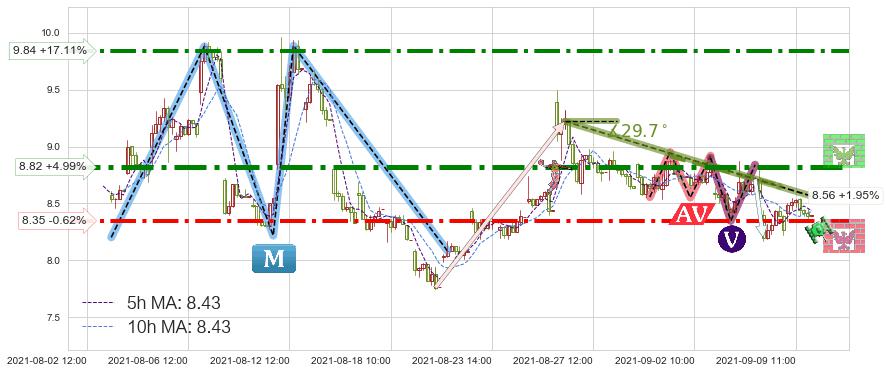 ➣ 预测:2021-09-15 14:00,【继续下探】稳定目前下跌趋势的前提下,预测价格:8.00