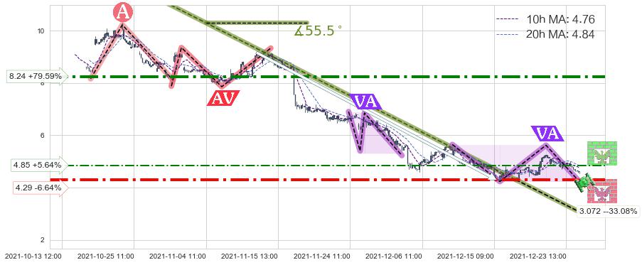 从2021-10-22 09:00至2021-12-16 16:00,共包含274个小时,阶段股价下跌-72.97%,阶段股价变动位移路程比: 1 : 4,下跌趋势角度: 55.5