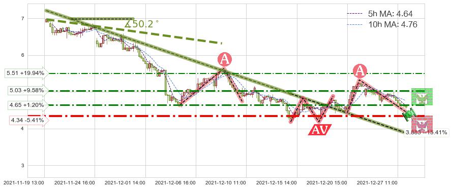 ⚔️ 2021-11-19 14:00-2021-12-15 11:00下跌趋势存在反转上涨[机会],其原下跌趋势的阻力位(3.883)已被突破[强支撑信号],原下跌趋势角度: 50.2˚