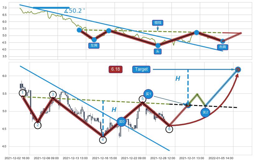➢ 最后的下跌趋势2021-11-19 14:00至2021-12-15 11:00:存在突破迹象,后续小反弹或者反转上涨