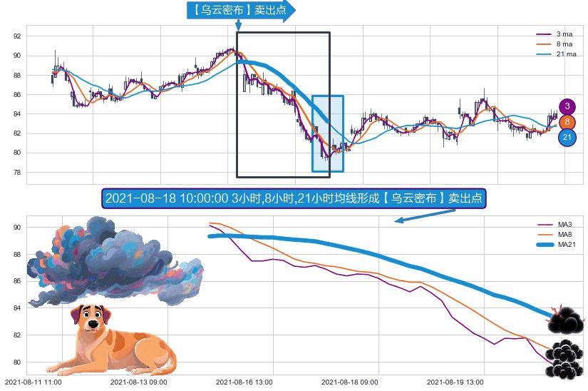 ⚀ 2021-08-13 13:00:00小时-2021-08-20 14:00:00小时显现 3小时-8小时-21小时均线 【乌云密布】卖出点 看空信号,后市看跌,卖出