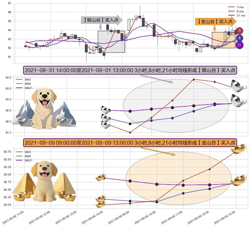 ⚀ 2021-09-09 10:00:00-小时至2021-09-09 13:00:00-小时显现 3小时-8小时-21小时均线 【金山谷】买入点 其再次确认了买入信号,可靠性更强,买入