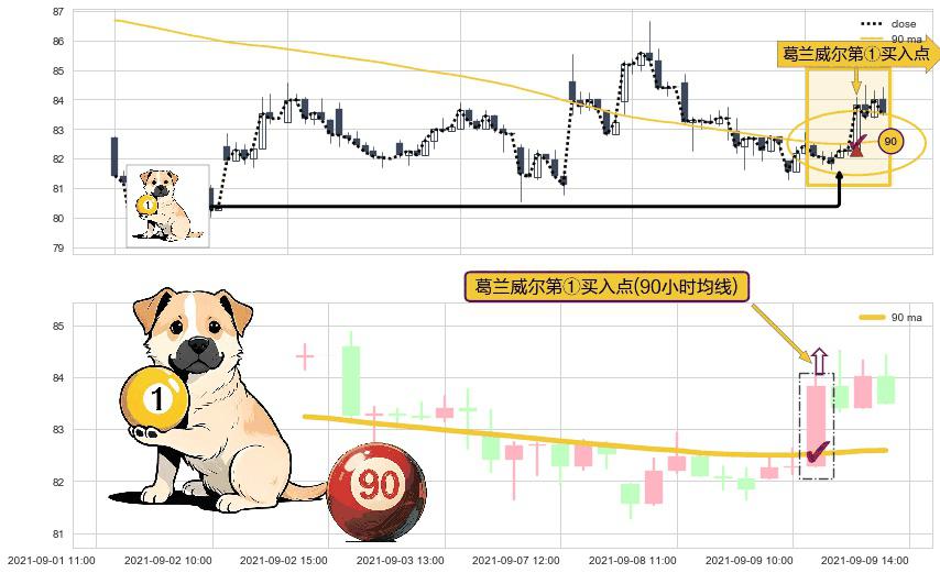 ⚀ 2021-09-09 11:00:00-小时显现 葛兰威尔均线 90小时均线 第买①入点 走势反转见底信号,后市看涨,买进信号