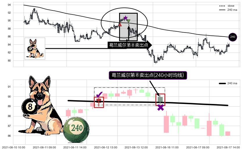 ⚀ 2021-08-13 14:00:00-小时显现 葛兰威尔均线 240小时均线 第⑧卖出点 下降趋势的中继信号,后市看跌,卖出信号