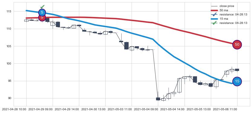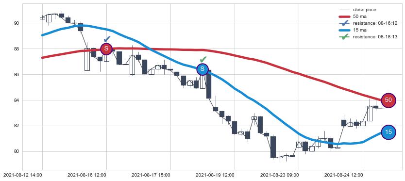 ⚂ 2021-08-12 10:00:00-小时均线向上突破,2021-08-13 14:00:00-小时重新下穿均线破位,均线阻力再次生效