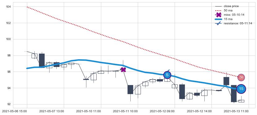 ⚄ 均线向上突破后价格围绕均线附近波动,并未远离均线,再次向下破位后维持原均线下跌趋势【极强】