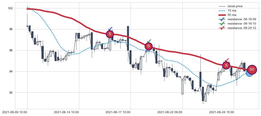 ⚄ 价格在均线遇到阻力后再次向下回落了【较短】距离, 第⑦卖出点 阻力效果【仍需验证】