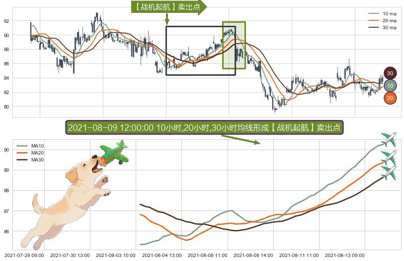⚀ 2021-08-03 11:00:00小时-2021-08-13 13:00:00小时显现 10小时-20小时-30小时均线 【战机起航】卖出点 看空信号,后市看跌,卖出