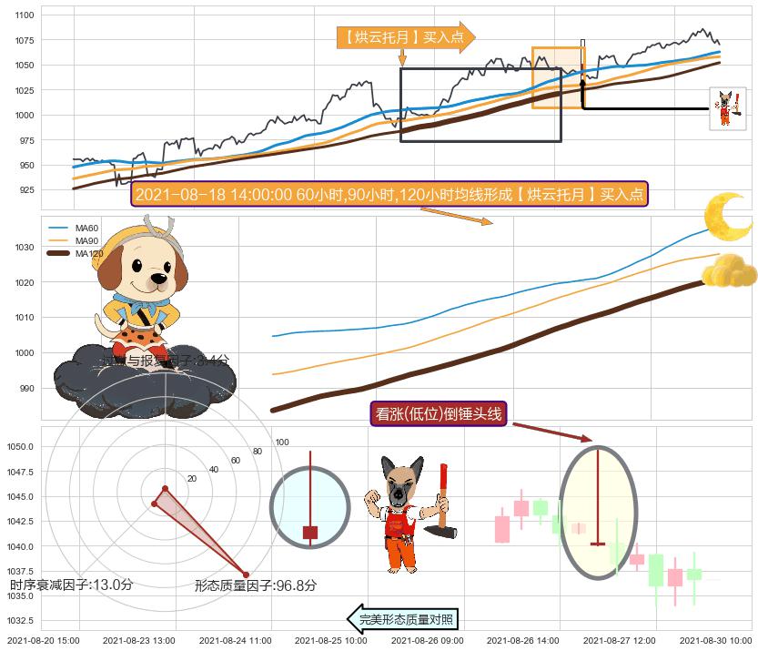 从2021-07-22 10:00至2021-08-11 11:00,共包含96个小时,阶段股价上涨1.63%,阶段股价变动位移路程比: 1 : 18