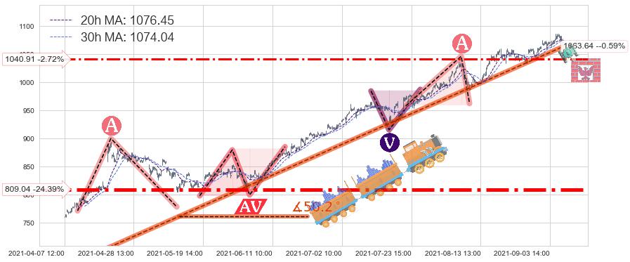 ➢ 预测:2021-09-10 12:00,【小幅回撤】稳定目前上涨趋势的前提下,预测价格:1066.92
