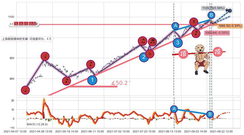 ♘ 在最后的上升阶段2021-04-07 12:00至2021-09-09 14:00存在 持续未破位的支撑位 ,支撑价格1063.64,支撑可信任强度88.80%,其距离最后价格1070.01相差 -0.59%