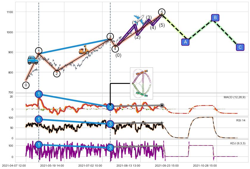 ➢ 1,3,5驱动浪MACD, RSI, KDJ走势都出现【常规背离】反转信号增强