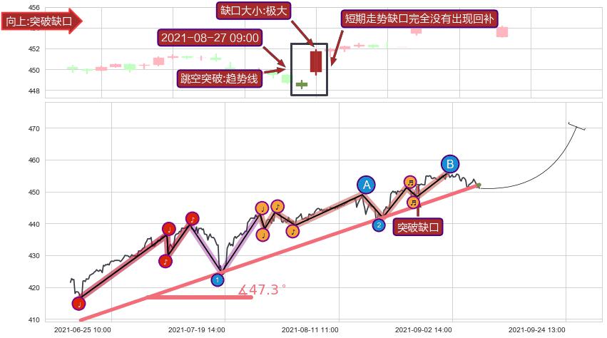 ♘ 在最后的上升阶段2021-06-18 14:00至2021-09-09 13:00存在 破位边缘的支撑位 ,支撑价格452.12,支撑可信任强度78.96%,其距离最后价格451.03相差 +0.24%